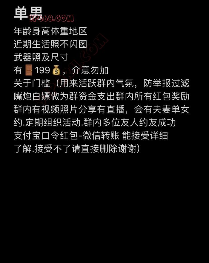 关于门槛:过滤嘴炮白嫖屌丝,作为群资金活跃气氛,群内视频照片分享直播,夫妻单女线下邀约,群内多位成员约友成功 .