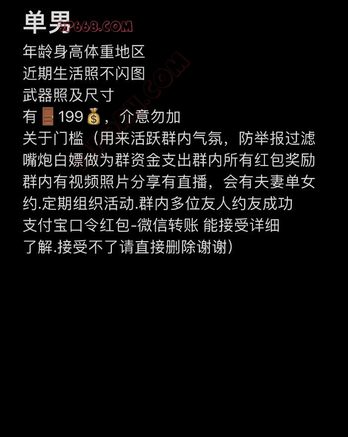 关于门槛:过滤嘴炮白嫖屌丝,作为群资金活跃气氛,群内视频照片分享直播,夫妻单女线下邀约,群内多位成员约友成功